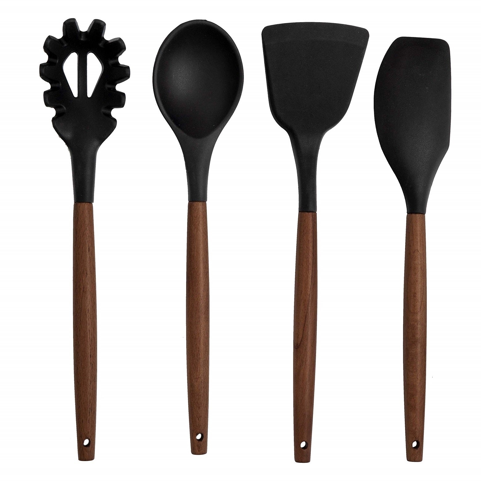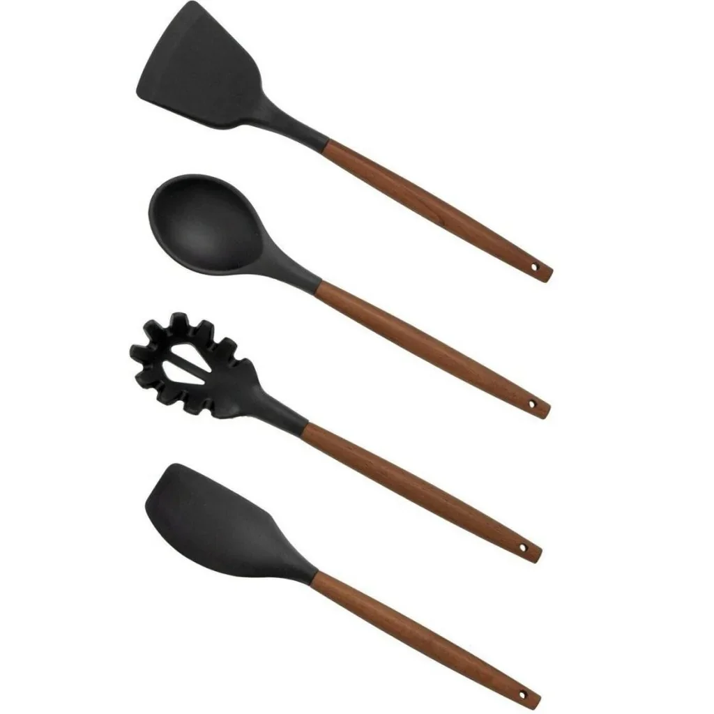 Елегантният комплект кухненски принадлежности, съчетава класически натурален дизайн и висока функционалност. Всеки от инструментите е изработен с ергономична дървена дръжка в топъл кафяв нюанс, която осигурява удобен захват и стабилност при готвене.