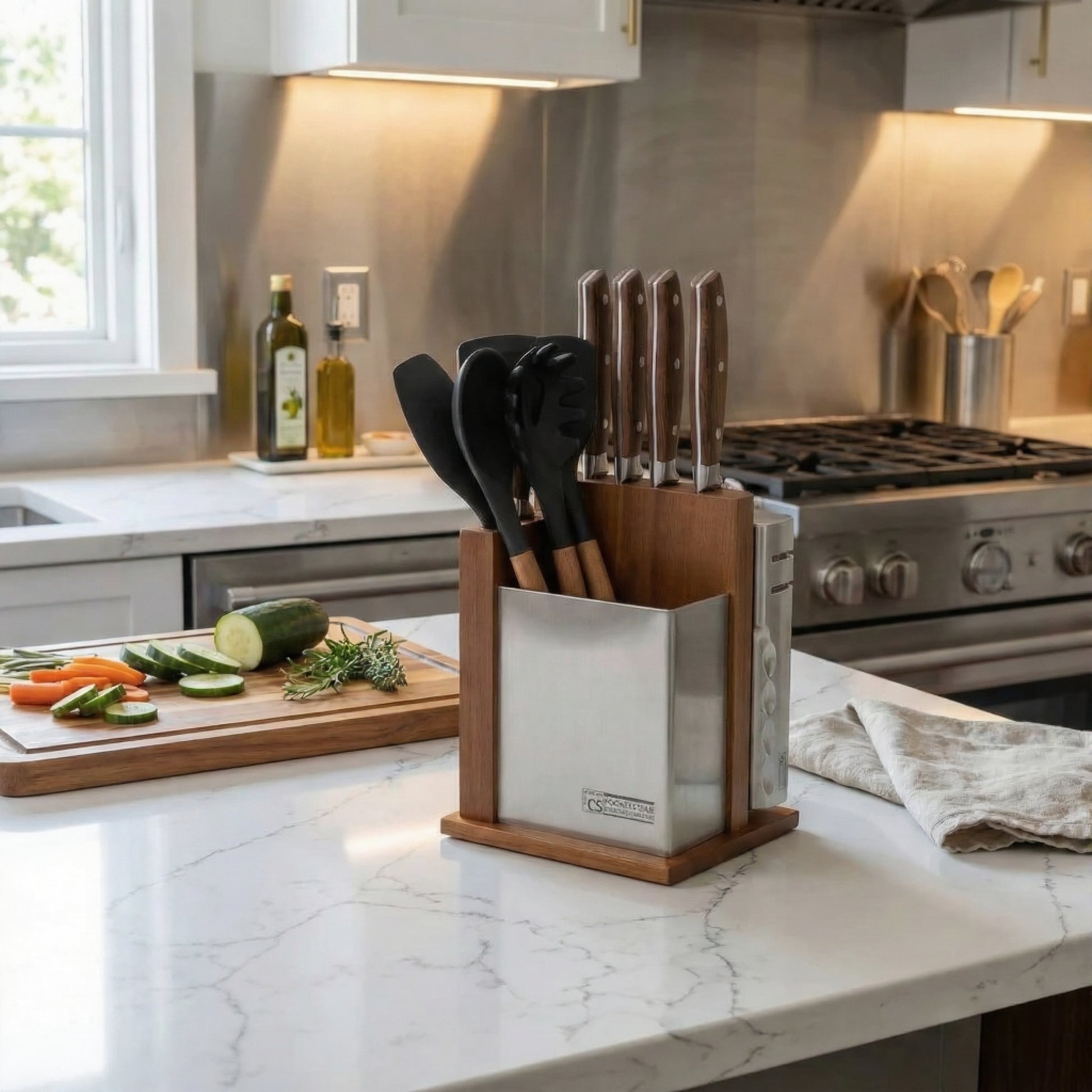 - Модерен дизайн: Дървеният блок с метални акценти е елегантен и компактен, което го прави перфектен за всяка кухня.