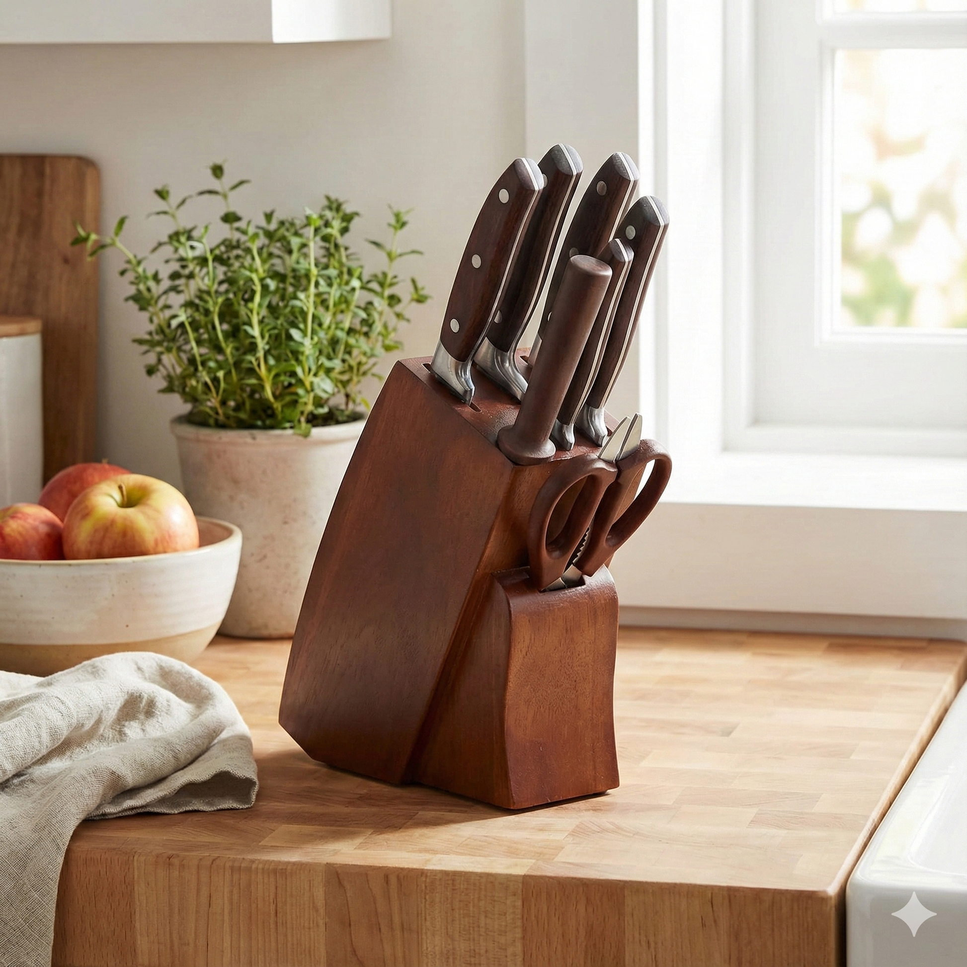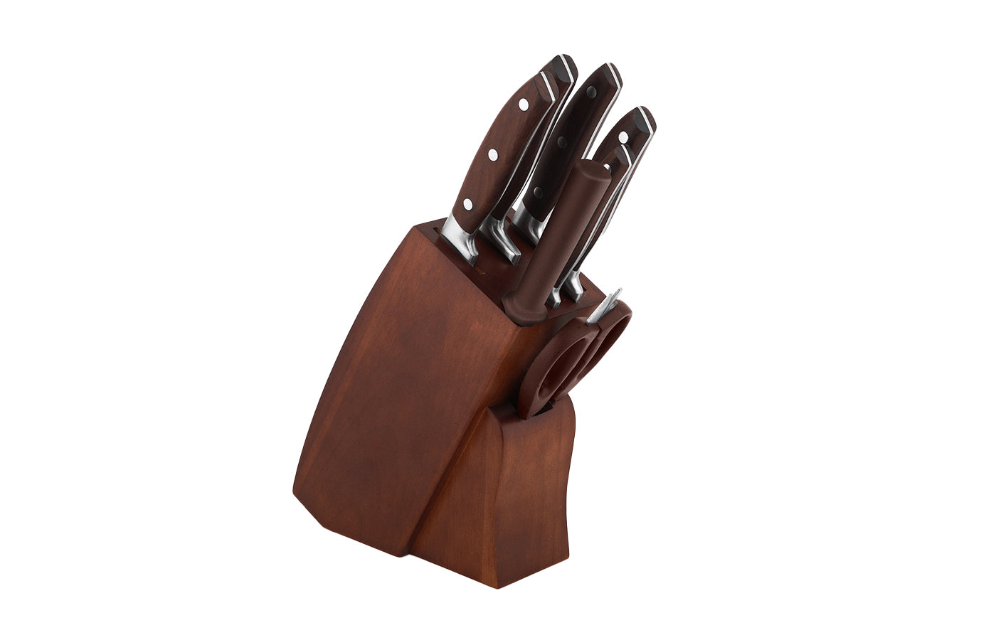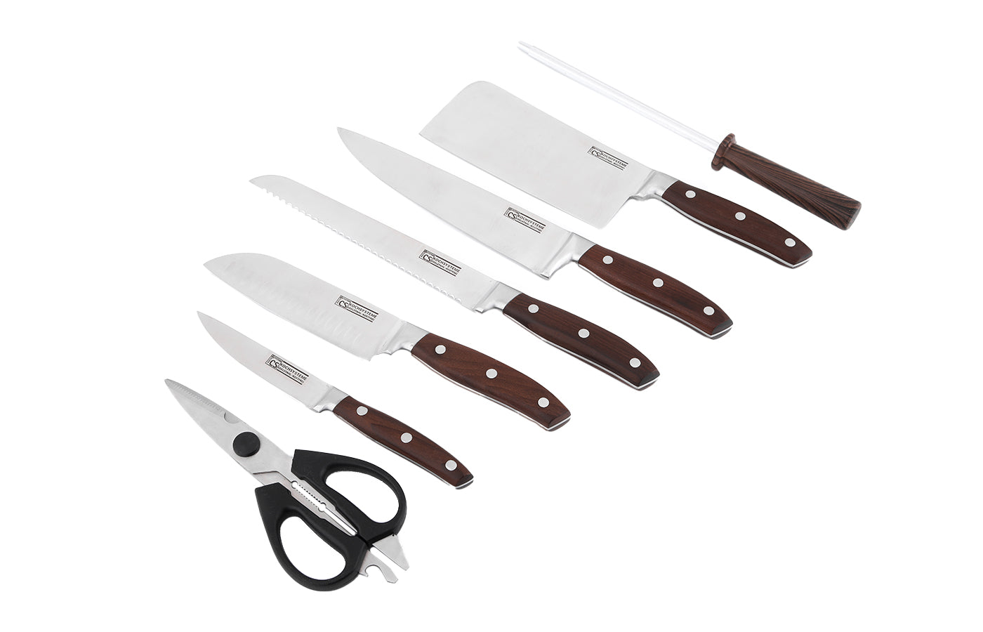 Комплект от 4 ножа, сатър и ножица и точило. Ножовете са изковани от цяла заготовка неръждаема стомана с изключително високо качество. Дръжките им са изработени от масивно дърво и спомагат за лесен захват.
