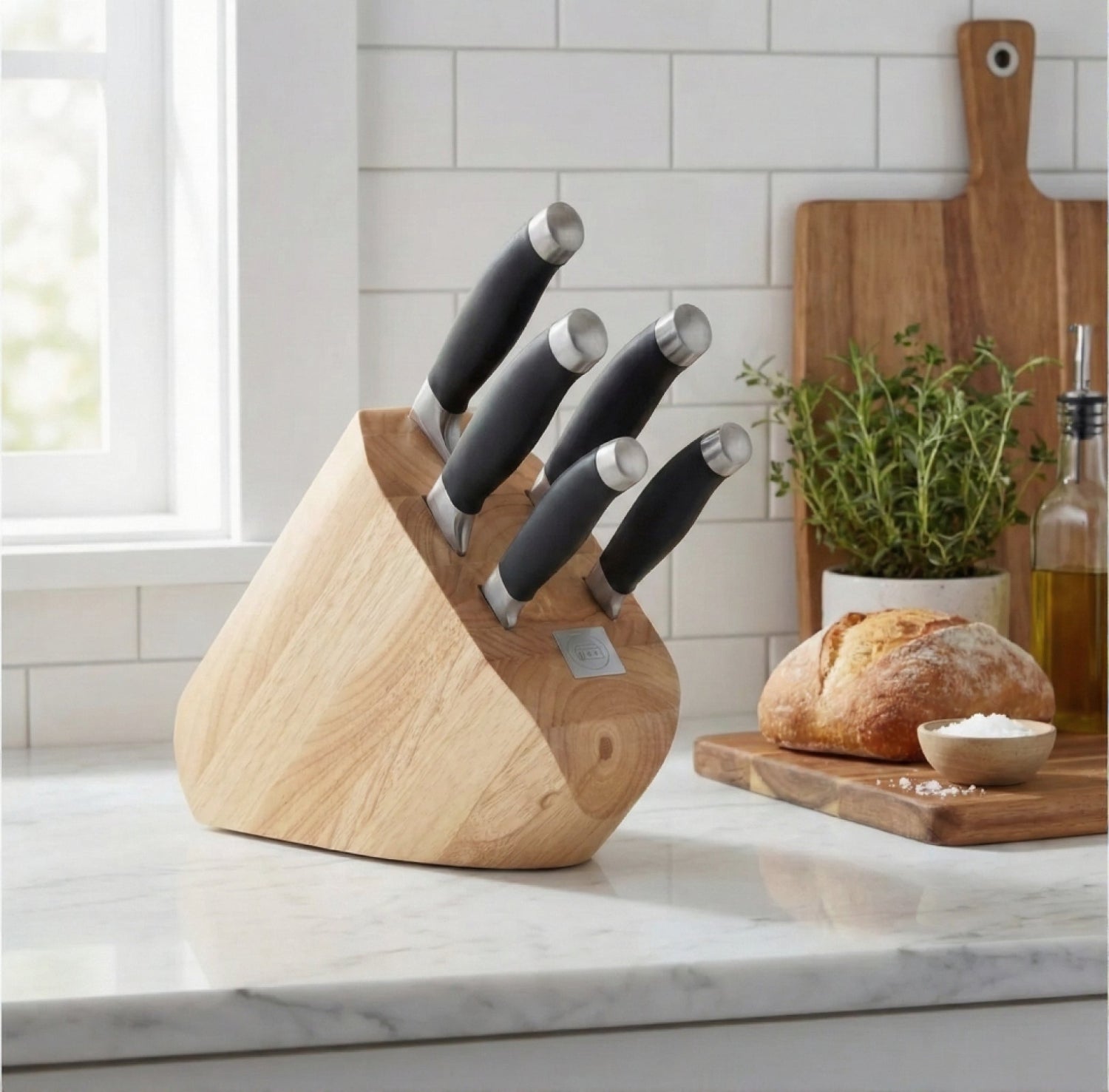 - Стилен дървен блок за съхранение: Комплектът включва блок от масивно дърво с бамбуков финиш, който придава изисканост на всяка кухня и осигурява безопасно съхранение на ножовете.